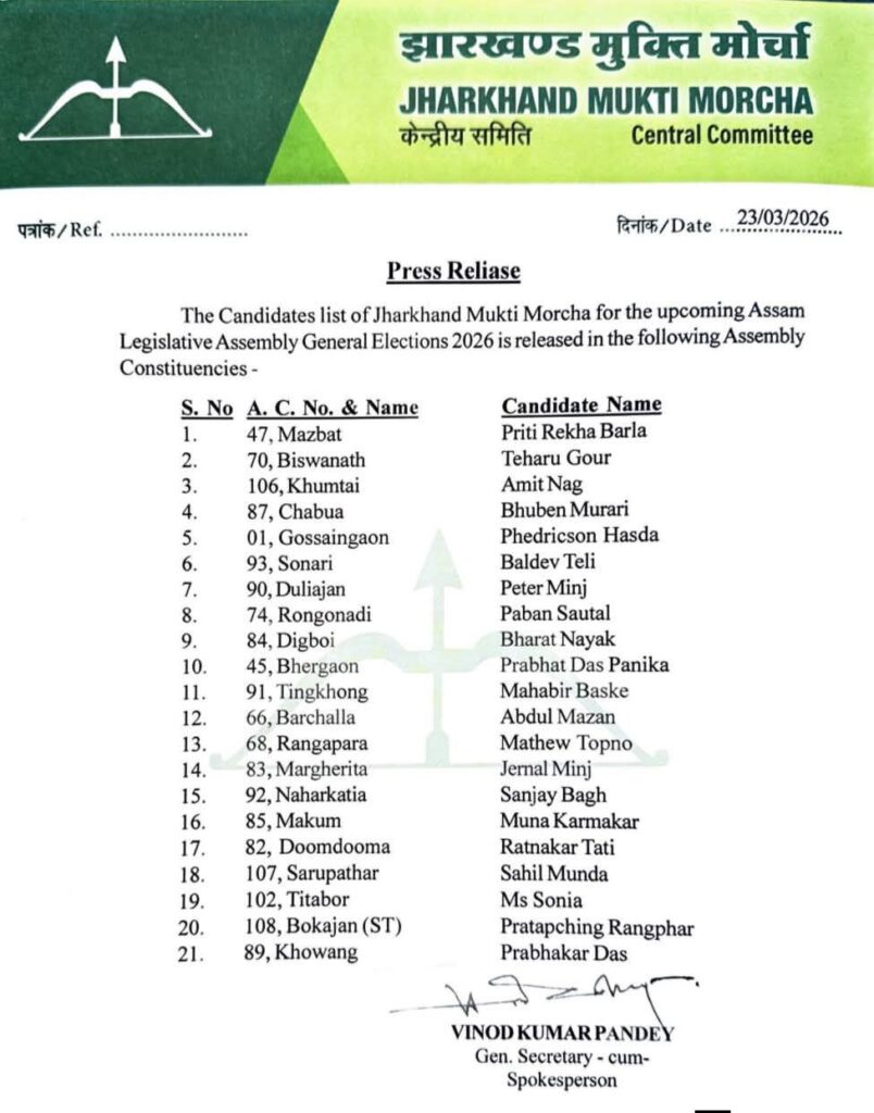 झारखंड मुक्ति मोर्चा के केंद्रीय महासचिव (संगठन) विनोद पांडेय द्वारा सभी प्रत्याशियों की सूची जारी कर दी गई है. जारी लिस्ट को लेकर जेएमएम केंद्रीय महासचिव ने कहा कि हम पहले भी असम में इक्का दुक्का स्थान पर चुनाव लड़ते रहे हैं. लेकिन इस बार फिरकापरस्त ताकतों को शिकस्त देने और असम के लोगों की आकांक्षाओं को पूरी करने के लिए कृतसंकल्पित होकर चुनाव लड़ रहे हैं.