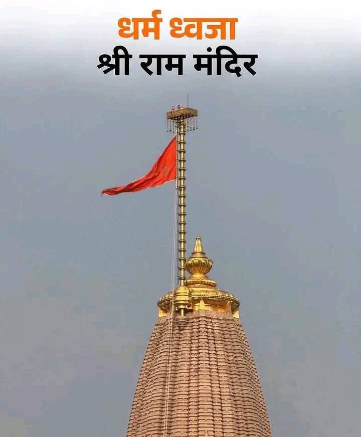 PM मोदी और RSS सरसंघचालक मोहन भागवत ने पवित्र श्री राम जन्मभूमि मंदिर के शिखर पर भगवा झंडा फहराया, जो मंदिर का निर्माण पूरा होने का प्रतीक है। 10 फीट ऊंचे और 20 फीट लंबे समकोण वाले तिकोने झंडे पर एक चमकते सूरज की तस्वीर है, जो भगवान श्री राम की चमक और वीरता का प्रतीक है, और इस पर कोविदाराऔर वीरता का प्रतीक है पेड़ की तस्वीर के साथ ‘ॐ’ लिखा है।