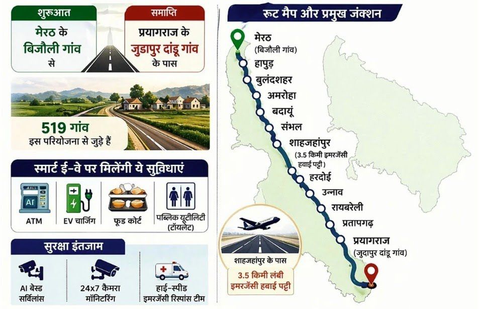 उत्तर प्रदेश के 12 जिलों और 519 गांवों को सीधे जोड़ने वाला यह एक्सप्रेसवे एक स्मार्ट और अत्याधुनिक कॉरिडोर है. पूरे रूट पर 9 वर्ल्ड‑क्लास फैसिलिटी सेंटर्स विकसित किए गए हैं, जहां 24 घंटे पेट्रोल, डीजल, CNG, इलेक्ट्रिक वाहन चार्जिंग, डॉर्मिटरी, स्टे सेंटर, स्पा, फूड कोर्ट और कैफेटेरिया की सुविधा मिलेगी. इसके साथ ही यहां 200 कार और 20 ट्रकों की पार्किंग व्यवस्था भी की गई है.