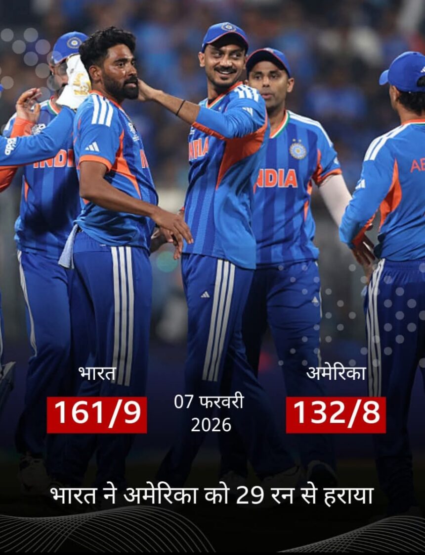 163 रन के लक्ष्य का पीछा करने उतरी USA की टीम ने शुरुआत में कुछ अच्छे शॉट्स जरूर लगाए, लेकिन भारतीय गेंदबाजों ने नियमित अंतराल पर विकेट निकालकर मैच पर अपनी पकड़ बनाए रखी। डेथ ओवर्स में भारत की सटीक गेंदबाजी और शानदार फील्डिंग ने USA की उम्मीदों को खत्म कर दिया। 20 ओवर पूरे खेलने के बावजूद USA लक्ष्य से 29 रन दूर रह गई और भारत ने टूर्नामेंट में अपनी पहली जीत के साथ 2 अहम अंक हासिल किए।