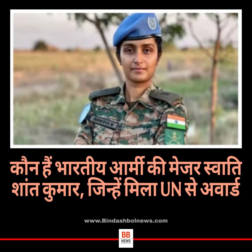 UN : दक्षिण सूडान में संयुक्त राष्ट्र मिशन (UNMISS) में सेवा दे रहीं भारतीय सेना की अधिकारी मेजर स्वाति शांत कुमार को यूएन महासचिव पुरस्कार मिला है। बेंगलुरु की रहने वाली स्वाति को यह प्रतिष्ठित पुरस्कार उनके ‘इक्वल पार्टनर्स, लास्टिंग पीस’ प्रोजेक्ट के लिए दिया गया। यूएन महासचिव एंटोनियो गुटेरेस ने रविवार को इस पुरस्कार की घोषणा की।